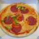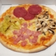 Tomatensaus, kaas, salami, ham, champignons en artisjokken