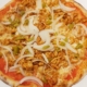Tomatensaus, kaas, gesneden kipfilet, uien en spaanse pepers