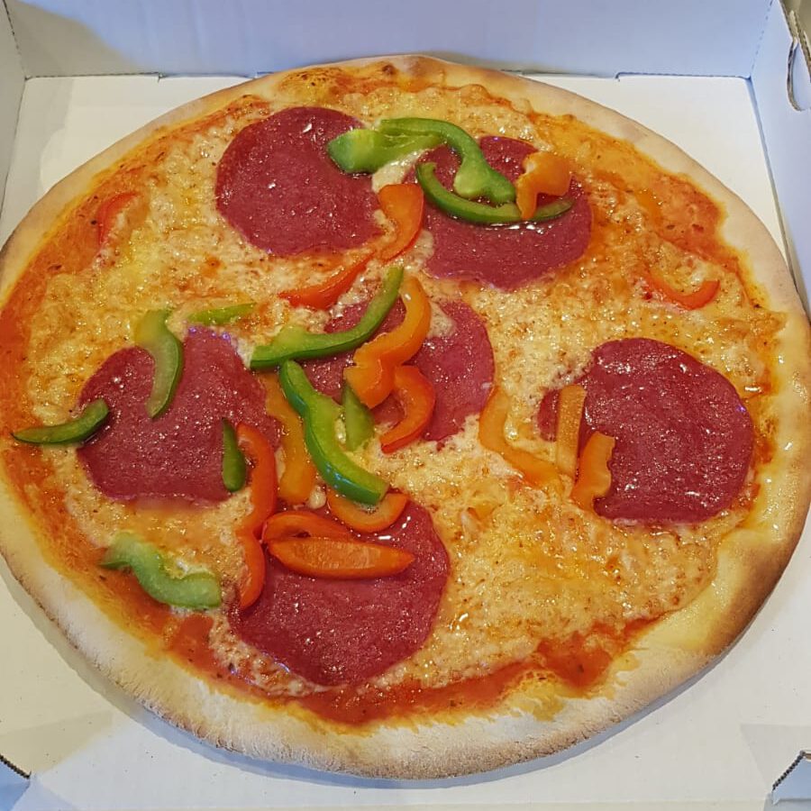 tomatensaus, kaas, salami en paprika