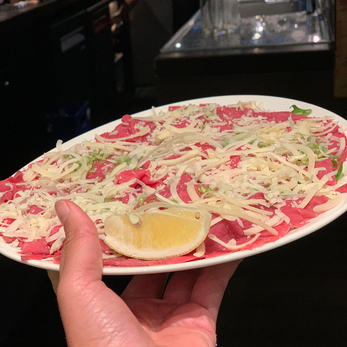 Traditioneel gesneden runderbiefstuk met pesto en parmezaanse kaas