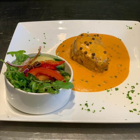 Pikante saucijsjes in tomatensaus met gemengde salade en frites of spaghetti